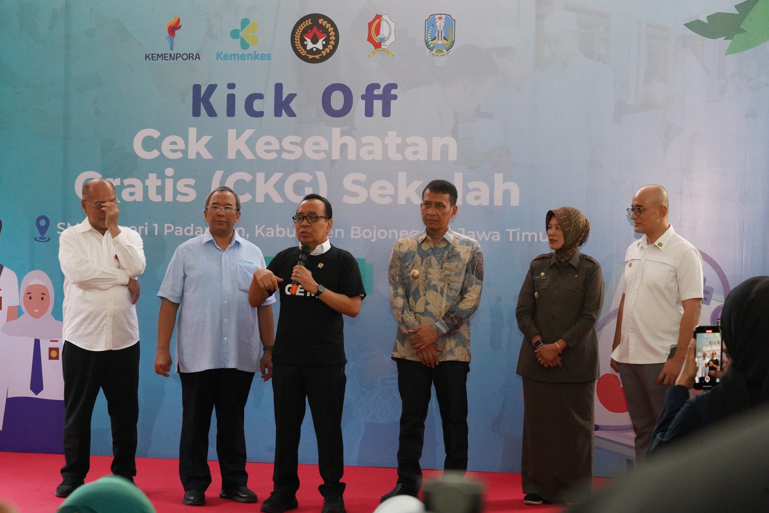 Bojonegoro- Menteri Koordinator Bidang Pembangunan Manusia dan Kebudayaan (Menko PMK) RI, Pratikno, hadir dalam kegiatan Kick Off Cek Kesehatan Gratis (CKG) di SMP Negeri 1 Padangan (4/8).