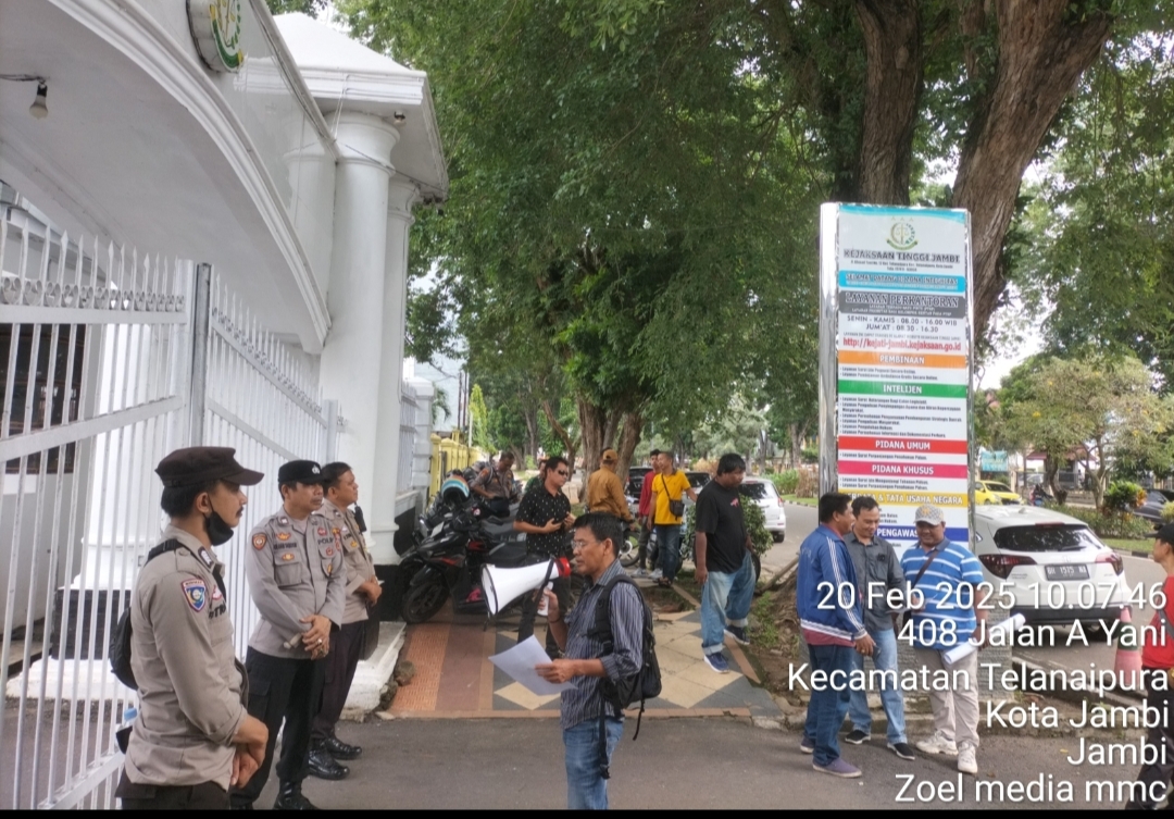 Kota Jambi mmcnews.id kamis 20-02-2025 Aliansi Masyarakat Anti Korupsi Jambi (AMAKJ) mengadakan aksi demo didepan kantor Kejaksaan Tinggi Jambi, terkait Pekerjaan jalan rabat beton lorong Masjid Darul Amanah yang berlokasi di RT 42 Desa Kasang Pudak Kec Kumpe Ulu Kab Muaro Jambi.