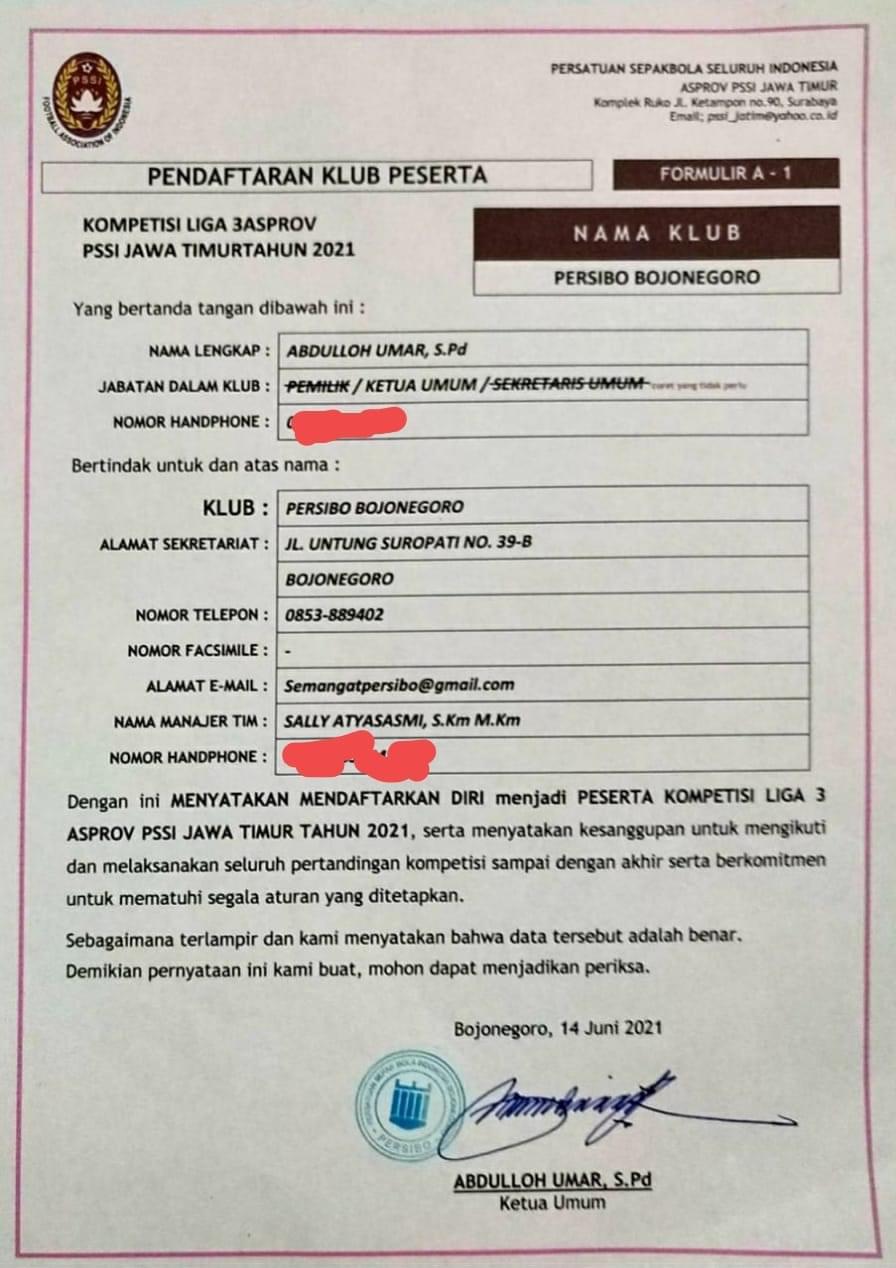 Bojonegoro ]MMCNEWS.ID , – Persibo Bojonegoro secara resmi mendaftarkan diri ke Liga 3 PSSI 2021, Senin (14/6/2021). Pendaftaran dilakukan manajemen Persibo ke Asprov dengan target maju ke Liga 2.