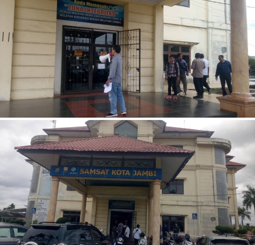 Saudara Harris SE menyampaikan orasinya didepan pelayanan kantor Samsat kota Jambi, diduga banyak biro jasa yang berada di kantor Samsat kota Jambi yang tidak memiliki legalitas berbadan hukum, yg di duga adanya dugaan pungli antara biro jasa dan cek fisik di kantor Samsat Kota Jambi.
