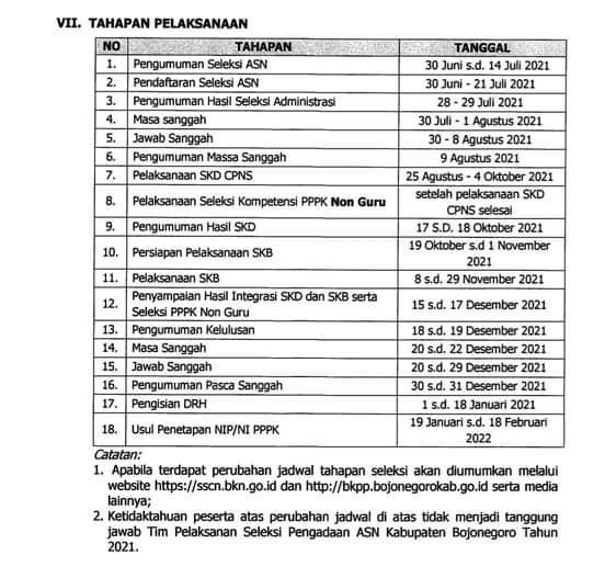 Berdasarkan keputusan Bupati Bojonegoro Nomor : 188/2726/412.301/2021 tanggal 25 Juni tentang penetapan Formasi Non Aparatur Sipil Negara (Pegawai Pemerintah dengan Perjanjian Kerja dan Pegawai Negeri Sipil dari Formasi Umum dan Formasi Khusus Penyandang Disabilitas) di lingkungan Pemerintah Kabupaten Bojonegoro tahun anggaran 2021, dibuka kesempatan bagi Putra/Putri Warga Negara Indonesia yang berminat menjadi Pegawai Aparatur Sipil Negara (ASN) yang terdiri Pegawai Negeri Sipil (PNS) dan Pegawai Pemerintah dengan Perjanjian Kerja (PPPK).