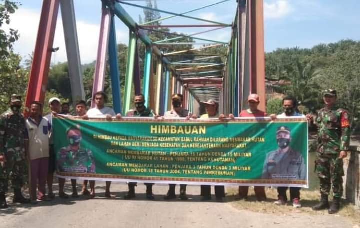 Aceh Tenggara – Cegah terjadinya Kebakaran Hutan dan Lahan (Karhutla) dimusim kemarau, Danramil 06/Babul Rahmah Kapten Arh Hamdanisyah, ST bersama Kapolsek Babul Rahmah Aipda D. Manurung, Kades Salim Pipit Sabri (44), Tomas dan masyarakat sekitar memasang spanduk larangan bakar hutan di Desa Salim Pipit Kecamatan Babul Rahmah Kabupaten Aceh Tenggara, Sabtu (20/02/2021).