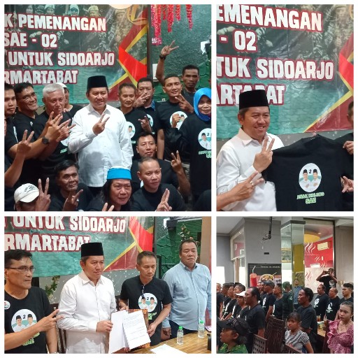 SIDOARJO | MMCNEWS – Konsolidasi relawan tergabung dalam Anak kolong Sidoarjo untuk pemenangan paslon 02-SAE lakukan deklarasi dukungan terhadap pasangan calon Mas iin -Edi Widodo di rumah makan asap asap jl raya taman pinang indah sidoarjo.(9/10/2024).
