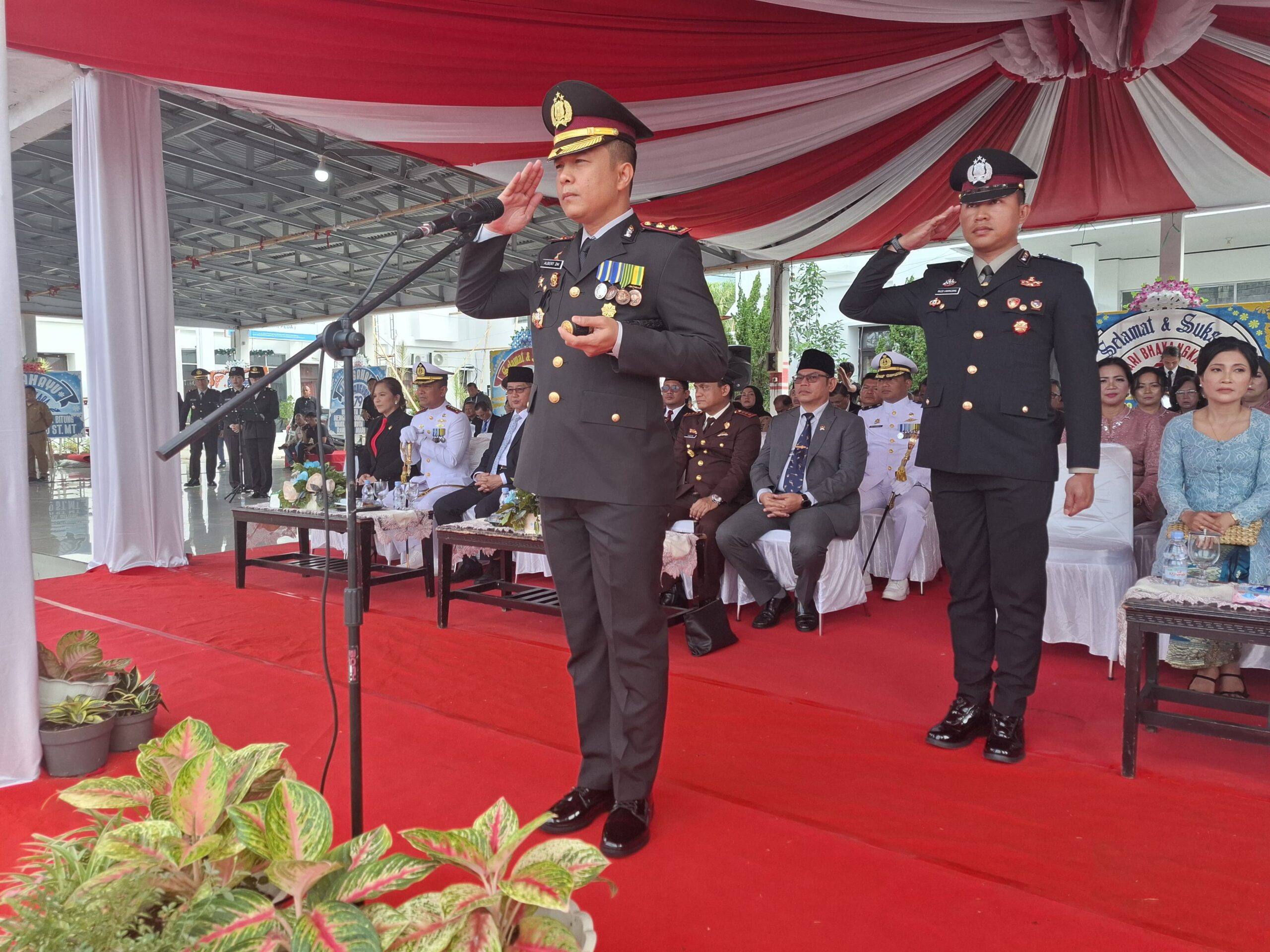 Dalam pelaksanaan upacara Tersebut dipimpin Langsung Oleh Kapolres Kota Bitung AKBP Albert Zai, SIK, MH, sebagai Inspektur Upacara, Kabag Ops Kompol Karel Tangay, SH., dan Kasat Lantas iptu Syarif Subarkah.,STrK, Sebagai Perwira upacara, Aiptu Nus Porda Leftewu, Sebagai Komandan upacara, serta Pengucap Tti Brata.