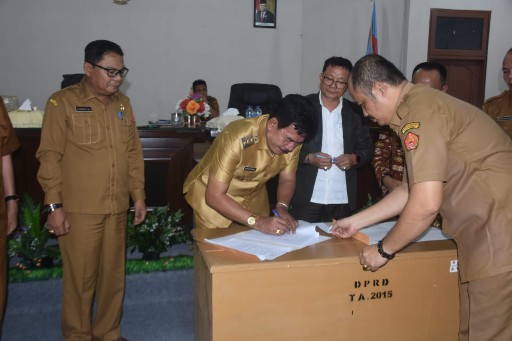 Bupati Khenoki Waruwu tandatangani berita acara persetujuan bersama Ranperda APBD Nias Barat TA. 2023, Selasa (22/11/2023)