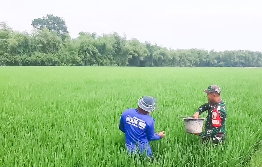 BOJONEGORO, – Dalam rangka mendukung program pemerintah dibidang ketahanan pangan, Bintara Pembina Desa atau Babinsa Koramil 03/Balen Kodim 0813 Bojonegoro, Serda Jamari, mendampingi salah satu petani Desa Sarirejo dalam merawat tanaman padi, Jum’at (27/12/2024).