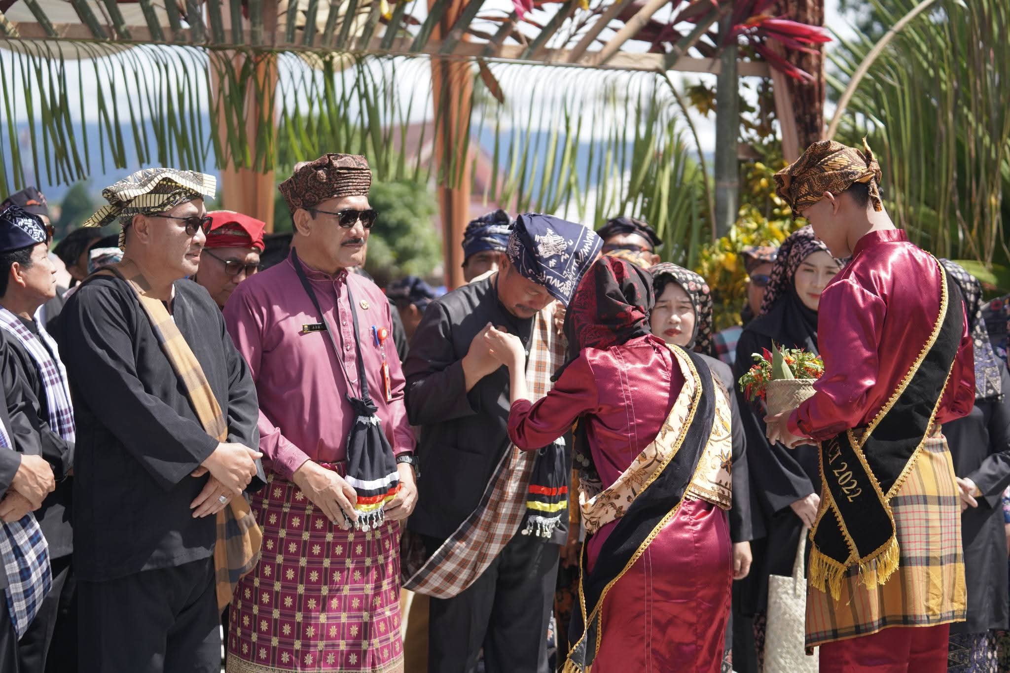 Kedatangan Bupati Monadi dan rombongan disambut dengan prosesi adat Bahuu, dentuman gong, serta barisan hulubalang dari tim silat. Prosesi dilanjutkan dengan sekapur sirih, penyandangan uncang, dan penyerahan bunga bakul sebagai bentuk penghormatan adat.