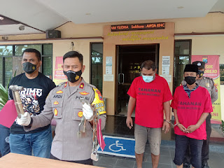 Saat Pres Release Kapolsek Mulyorejo Kompol Ardi Purboyo., SH., MM., SIK., mengatakan, kedua tersangka ditangkap setelah dilaporkan oleh pemilik rumah.