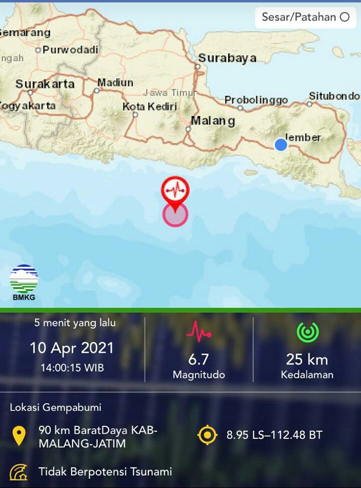 Dari data yang dihimpun awak media dari informasi yang beredar terdeteksi waktu gempa sekira pukul 14:00 lebih 15 detik terletak di Malang Selatan dengan kedalaman 25 km.