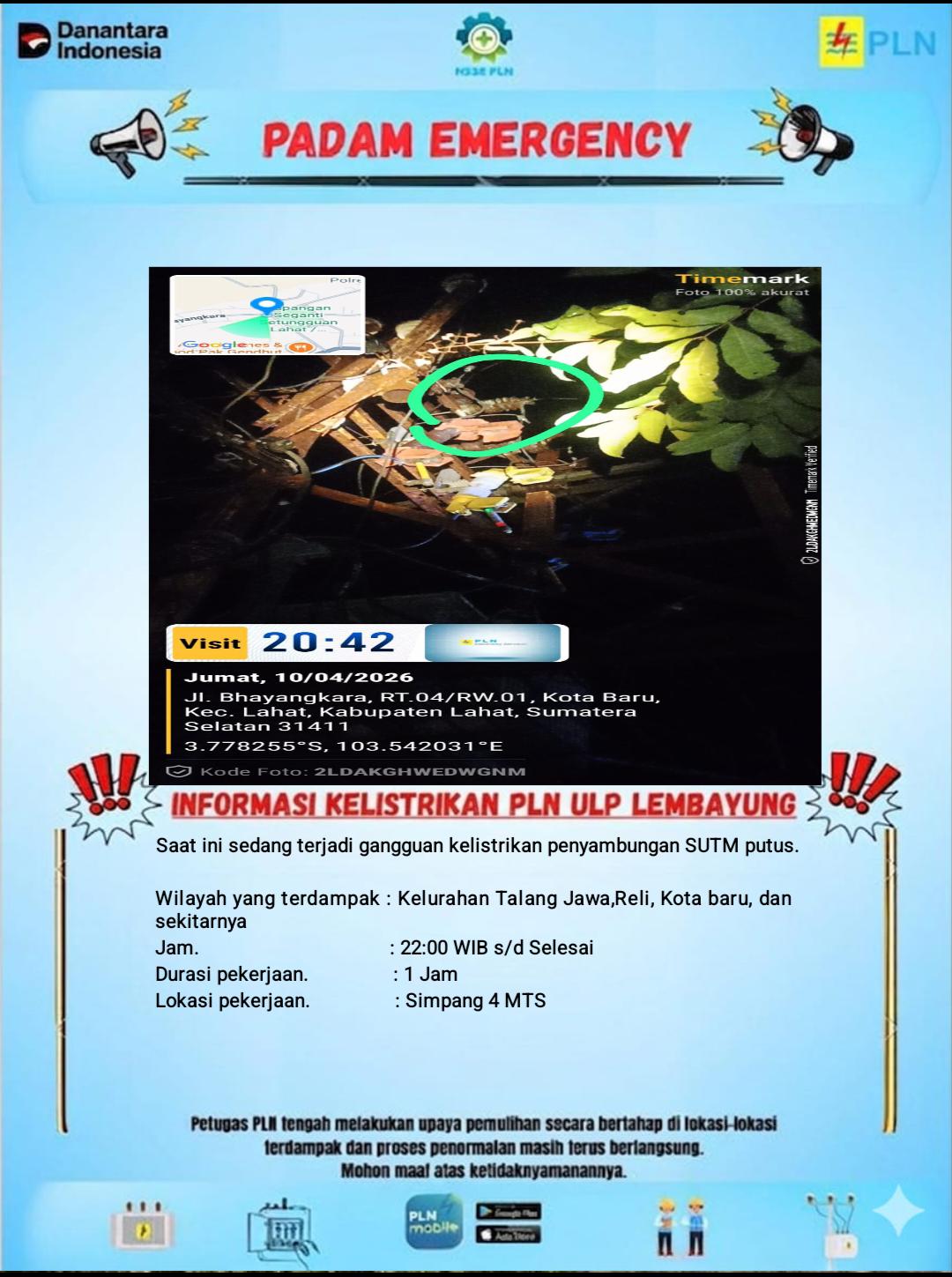 Izin menginfokan padam emergency di kota lahat daerah terdampak Kelurahan Talang Jawa,Kota baru, reli, dan sekitarnya yang disebabkan oleh kabel jumperan SUTM putus di simpang 4 MTS , sehingga akan menyebabkan pemadaman listrik jam 22:00. Saat ini petugas PLN sedang mengupayakan perbaikan secepatnya untuk estimasi pekerjaan kurang lebih +-60 menit.