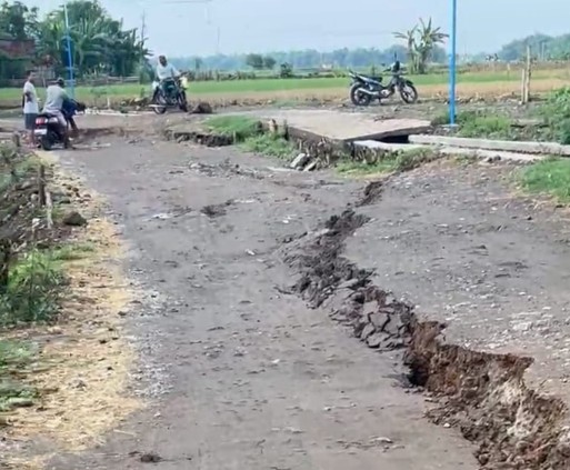 NGANJUK — Jalan penghubung antara Desa Jintel dan Desa Kedung Padang, Kecamatan Rejoso, Kabupaten Nganjuk, kembali amblas pada Minggu pagi (26/10/2025). Kerusakan terjadi setelah hujan deras mengguyur wilayah tersebut sejak Sabtu malam.