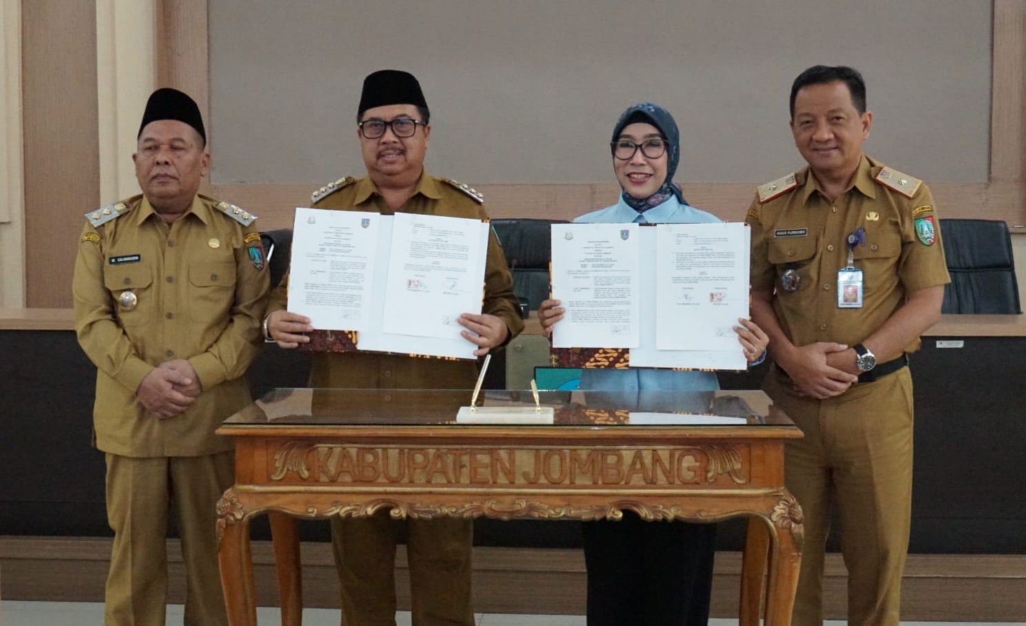 Bertempat di Ruang Swagata Pendopo Kabupaten, Bupati Jombang Warsubi dan Kepala Kejari Jombang Dyah Ambarwati meneken Memorandum of Understanding (MoU) terkait penanganan masalah hukum Bidang Perdata dan Tata Usaha Negara (Datun).