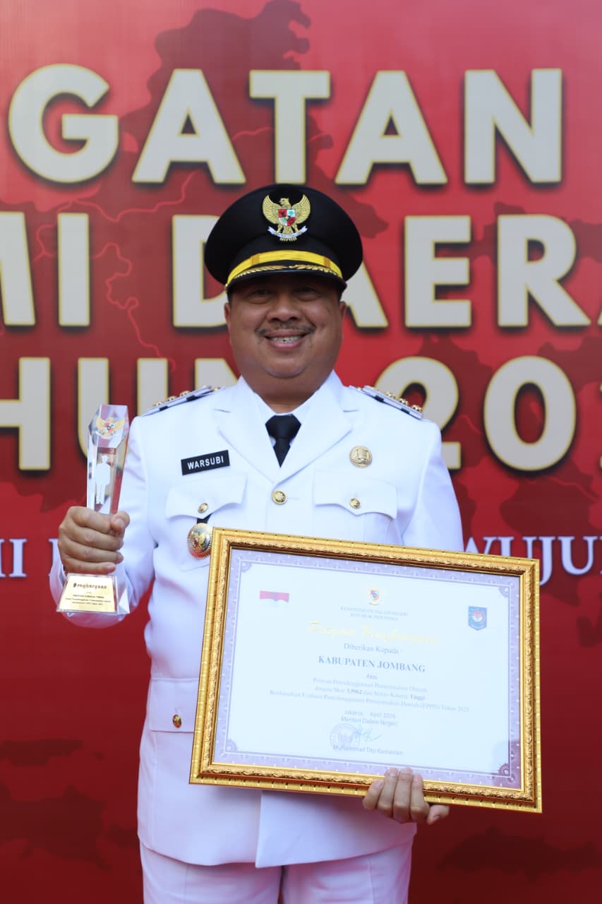 MMCNEWS.ID | Pemerintah Kabupaten Jombang, Jawa Timur kembali menorehkan prestasi gemilang di tingkat nasional. Bupati Jombang, Warsubi, S.H., M.Si., menerima Piagam Penghargaan Hasil Evaluasi Penyelenggaraan Pemerintahan Daerah (EPPD) dalam upacara peringatan Hari Otonomi Daerah (Otoda) XXX yang digelar di Plaza Kementerian Dalam Negeri, Jakarta Pusat, Senin (27/4/2026).