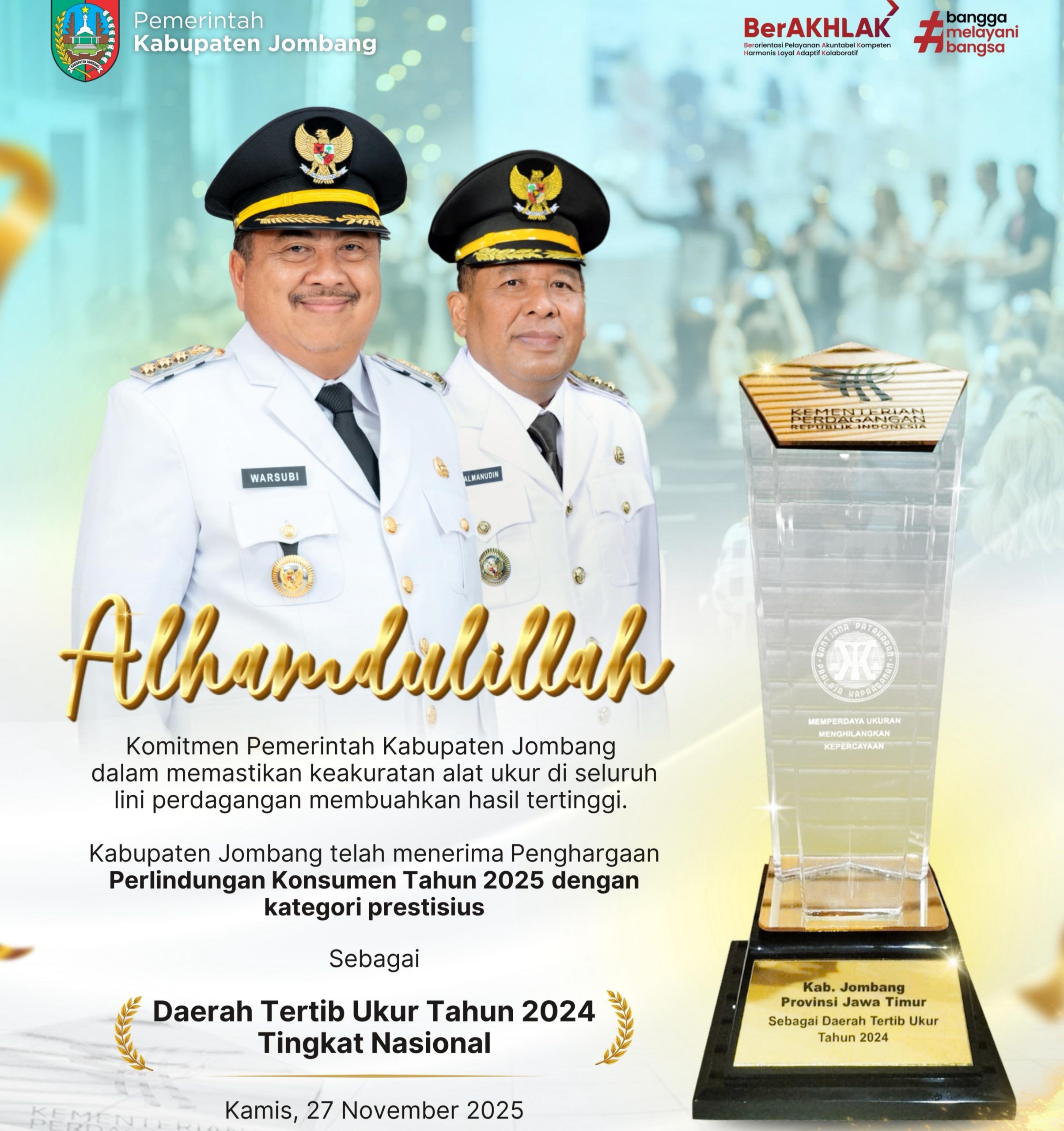 MMCNEWS.ID | Komitmen teguh Pemerintah Kabupaten Jombang dalam menjamin keakuratan alat ukur di seluruh sektor perdagangan berbuah pengakuan tertinggi. Kabupaten Jombang dinobatkan sebagai penerima anugerah bergengsi Daerah Tertib Ukur Tahun 2024 Tingkat Nasional dalam ajang Penghargaan Perlindungan Konsumen Tahun 2025 yang diselenggarakan oleh Kementerian Perdagangan (Kemendag) RI.