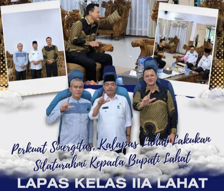 Dalam rangka mempererat sinergi hubungan antar Institusi Kepala Lembaga Pemasyarakatan (Kalapas) Kelas IIA Lahat, Reza Meidiansyah Purnama , Amd .IP.SH. MSi didampingi KA.KPLP Sukma Amri.S.Sos melakukan kunjungan kerja dan silaturahmi ke Pemerintah Kabupaten Lahat. Kegiatan ini bertujuan agar hubungan baik yang sudah terjalin antara lembaga pemasyarakatan dan pemerintah daerah serta dikemas dalam suasana kebersamaan melalui acara buka puasa bersama.