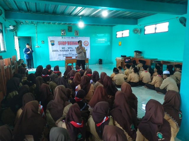 SIDOARJO | MMCNEWS -Untuk meningkatkan kesadaran siswa tentang bahaya dan dampak negatif bullying, Kanit Binmas Polsek Krembung bersama Bhabinkamtibmas Desa Ploso melaksanakan kegiatan pembinaan dan penyuluhan (binluh) di Madrasah Aliyah (MA) Abil Hasal Asy Syadzily, Sabtu (19/10).