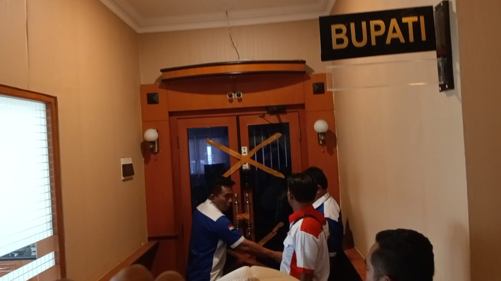 Menyikapi ruang kerja Bupati yang kosong, spontanitas Segenap Perwakilan Aktifis LSM yang di pimpin Nur Hasan langsung menyegel pintu ruang kerja PJ Bupati.
