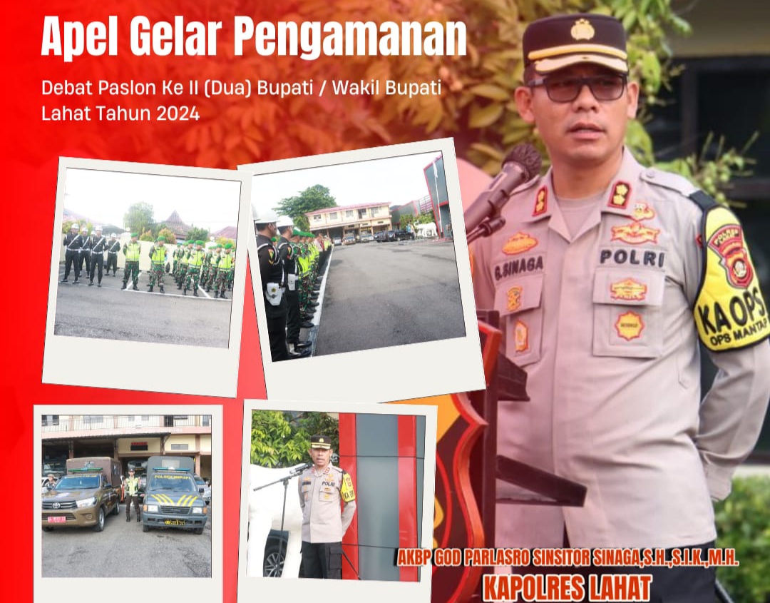 Bertempat di Halaman Mapolres Lahat Polda Sumsel sekira Pukul 09.00 Wib telah dilaksanakan Apel persiapan pengamanan menjelang Debat publik ke II ( dua ) pasangan calon Bupati dan Wakil Bupati Lahat 2024 yang akan di gelar di Hotel Santika sekitar pukul 18.30 wib hingga selesai dipimpin langsung Kapolres Lahat AKBP God Parlasro S. Sinaga SH.SIK.MH