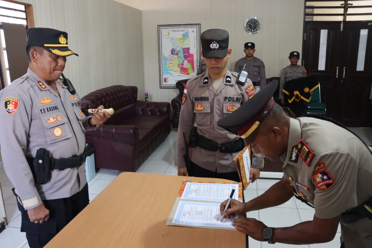 Mappi, Mmcnews – Kapolres Mappi AKBP Yustinus S. Kadang S.Sos., M.Si, pimpin upacara pengukuhan AKP Wisan Krebru, S.H sebagai Kepala Bagian Operasional (kabag Ops) Polres Mappi bertempat di ruang Kapolres Mappi. Senin (17 Februari 2025 ).