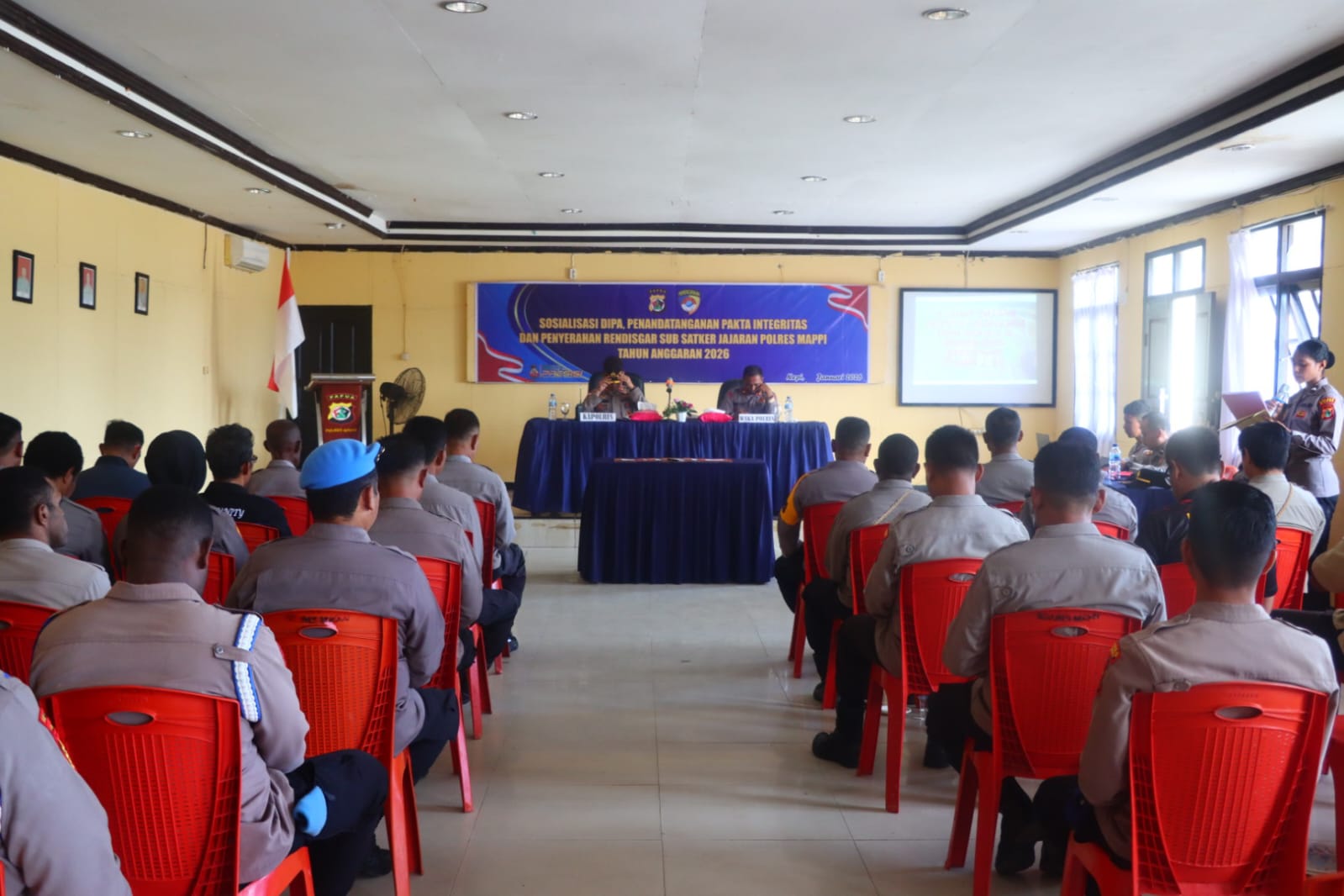 Mappi, Mmcnews – Kapolres Mappi Kompol Suparmin, S.IP., M.H. memimpin sosialisasi Daftar Isian Pelaksanaan Anggaran (DIPA) serta penandatanganan Pakta Integritas Tahun Anggaran 2026 di Aula Rupatama Polres Mappi, Rabu (14/1/2026).