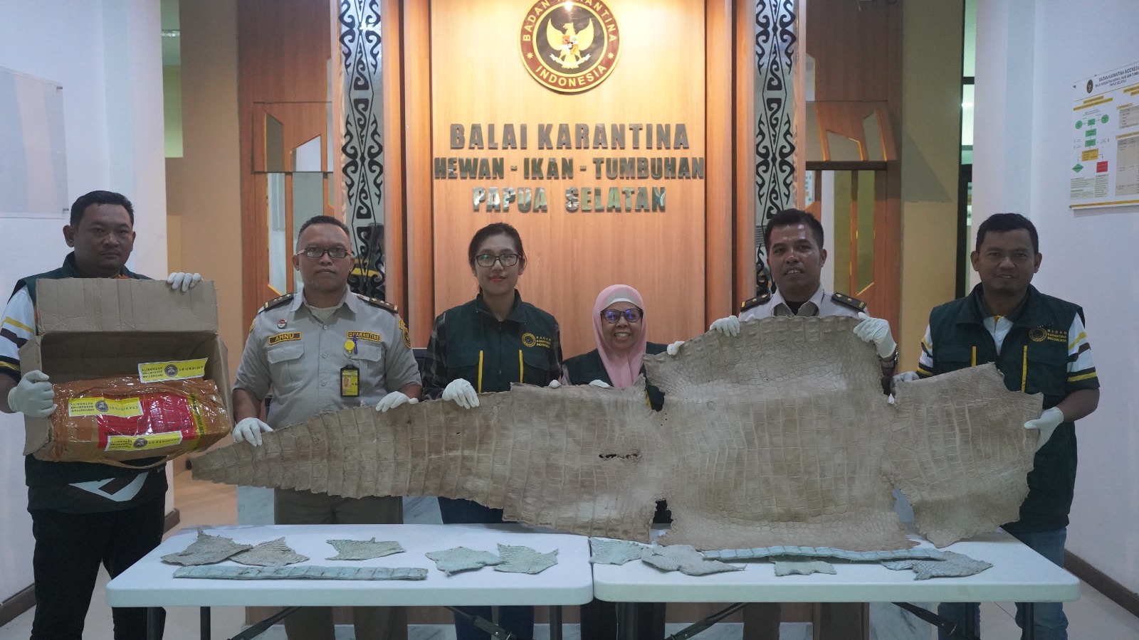 Merauke, Mmcnews – Karantina Papua Selatan melalui Satuan Pelayanan (Satpel) Bandara Mopah bersama Avsec Bandara Mopah berhasil menahan satu lembar kulit buaya pada Jumat (15/11).