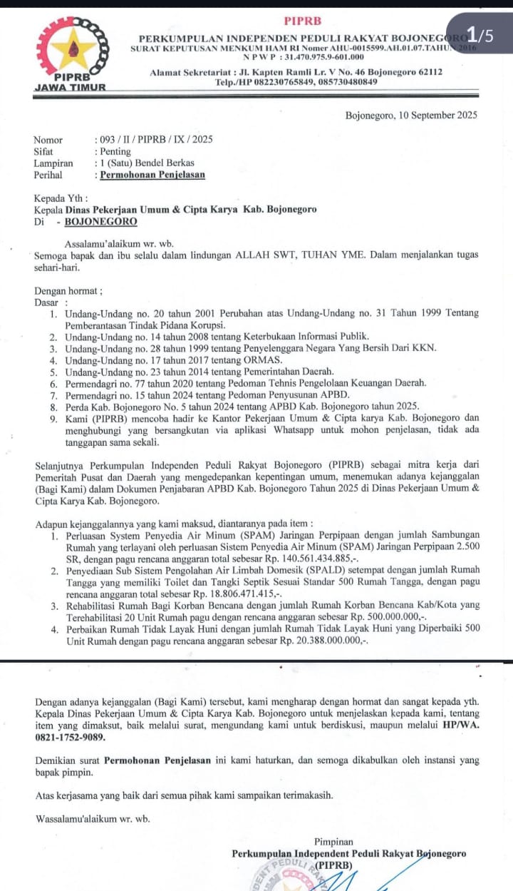 Bojonegoro||mmcnews.id – adanya kejanggalan anggaran APBD Tahun 2025 di dinas PU cipta karya, LSM PIPRB (perkumpulan independen peduli rakyat Bojonegoro) yang beralamat di Jalan Kapten Ramli Ledok Wetan Bojonegoro melayangkan surat Permohonan Penjelasan atau audiensi ke dinas PU Cipta Karya dan Bupati serta DPRD Bojonegoro.