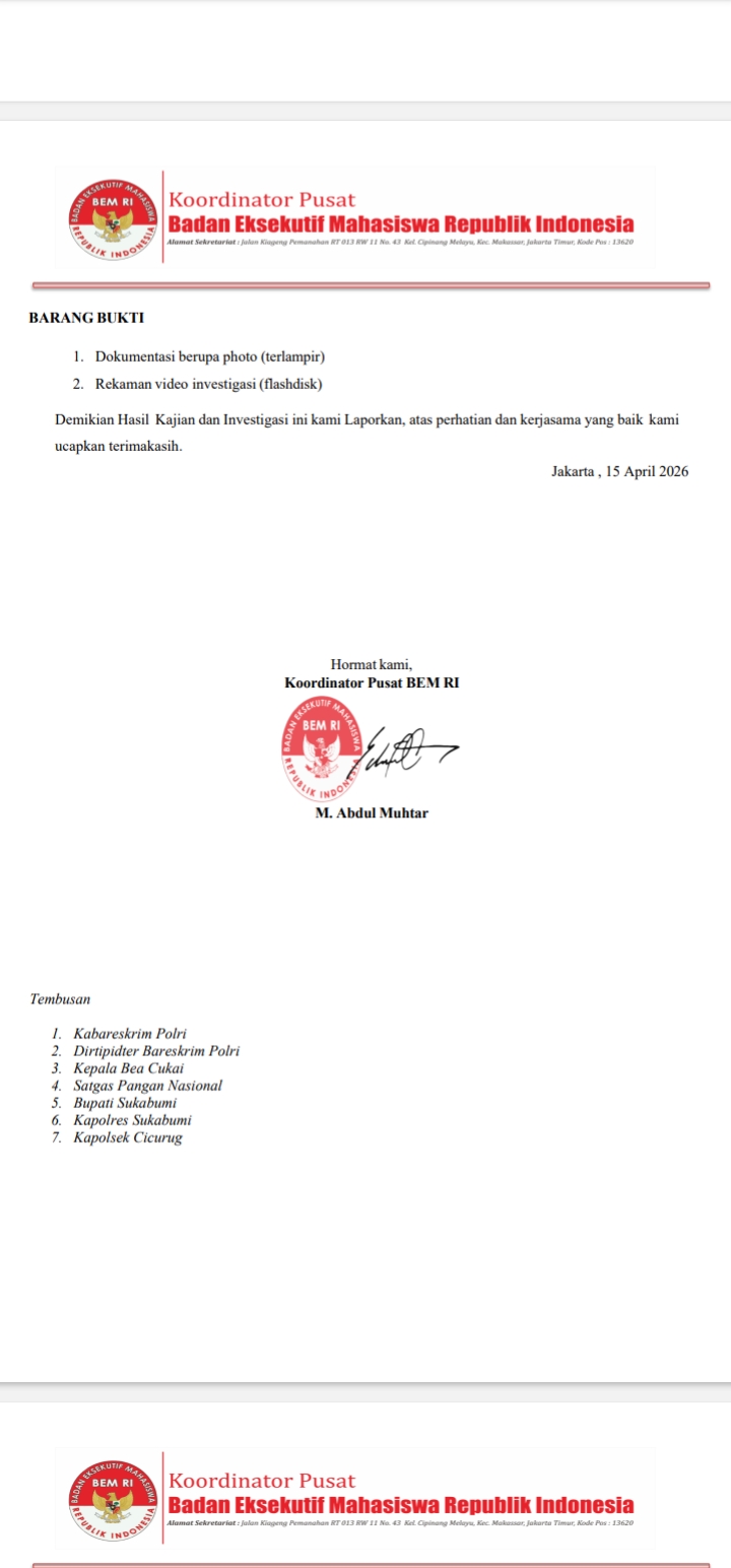 Badan Eksekutif Mahasiswa Republik Indonesia (BEM RI) tidak tinggal diam. Melalui surat resmi bernomor 240/SEK/BRI-JKT/I/2026, mereka mengirimkan Permohonan Atensi langsung kepada Kapolres Sukabumi, AKBP Dr. Saiman, S.H., S.I.K., M.Si., untuk menuntut tindakan hukum yang nyata.