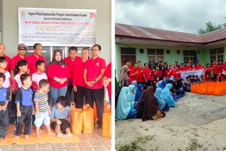 Pada giat tersebut, tampak Ikatan Notaris Indonesia Wiayah Kepulauan Riau, termasuk seluruh notaris yang ada di Kabupaten Karimun, menyerahkan bantuan ratusan paket sembako kepada seluruh anak yang bernaung di Panti Asuhan Jehova Jireh Karimun dan Pondok Pesantren Hidayatullah, Smemal Karimun.