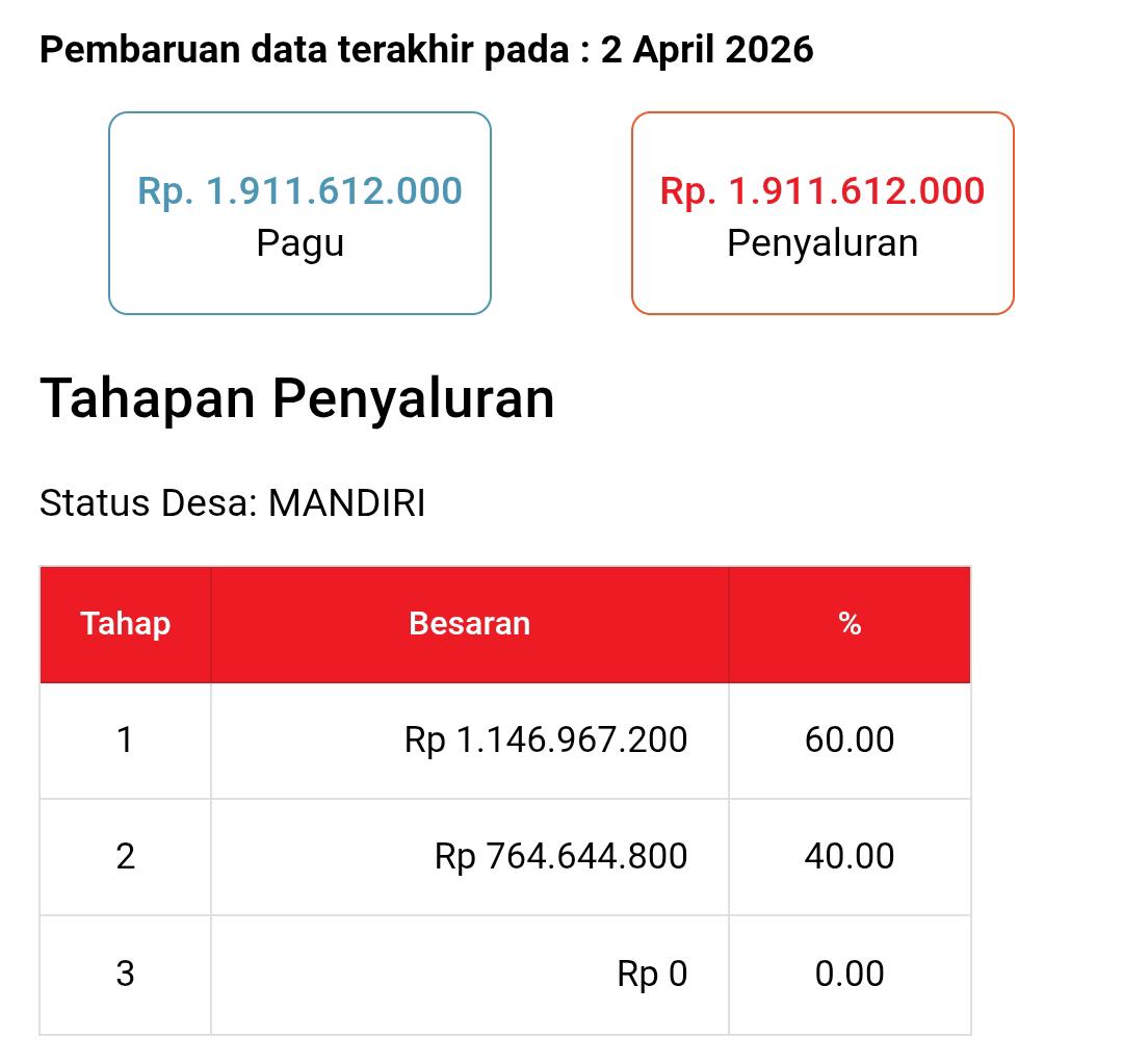 Data terbaru per tanggal 2 April 2026 menunjukkan bahwa dana tersebut sudah tersalurkan 100%. Namun yang menjadi sorotan tajam publik, di samping anggaran reguler, desa ini juga mendapatkan tambahan anggaran perawatan infrastruktur senilai Rp 1 Miliar.