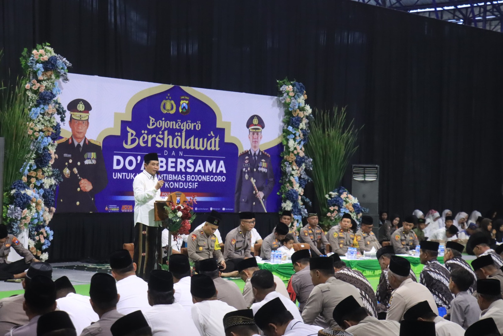 Bojonegoro – Dalam rangka menjaga keamanan dan ketertiban masyarakat (harkamtibmas) menjelang Hari Raya Idul Fitri 1446 H, Polres Bojonegoro menggelar acara “Bojonegoro Bersholawat dan Do’a Bersama” di GOR Mapolres Bojonegoro, Sabtu (22/3/2025) sore.