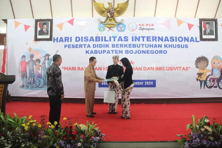 Bojonegoro – Musyawarah Kerja Kepala Sekolah Pendidikan Khusus dan Pendidikan Layanan Khusus (MKKS PK-PLK) menyelenggarakan pawai, pentas seni, hingga pameran hasil karya peserta didik berkebutuhan khusus. Kegiatan ini dalam rangka peringatan Hari Disabilitas Internasional Tahun 2024 di Pendopo Malowopati, Selasa (3/12/2024).