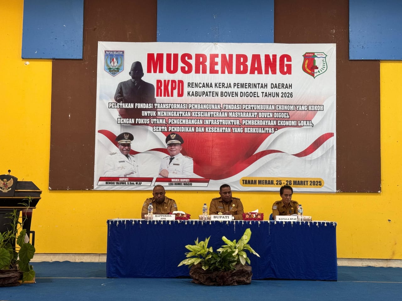 Musrenbang yang dipimpin oleh Bupati Hengki Yaluwo, S.Sos, didampingi oleh Sekretaris Daerah (Sekda) dan Kepala Bappeda Kabupaten Boven Digoel, bertujuan untuk merumuskan rencana pembangunan yang akan dilaksanakan di tingkat kabupaten. Kegiatan ini menjadi forum penting untuk menyelaraskan berbagai usulan dan prioritas pembangunan dari berbagai pihak, dengan fokus pada kebutuhan masyarakat di tingkat desa dan kecamatan.