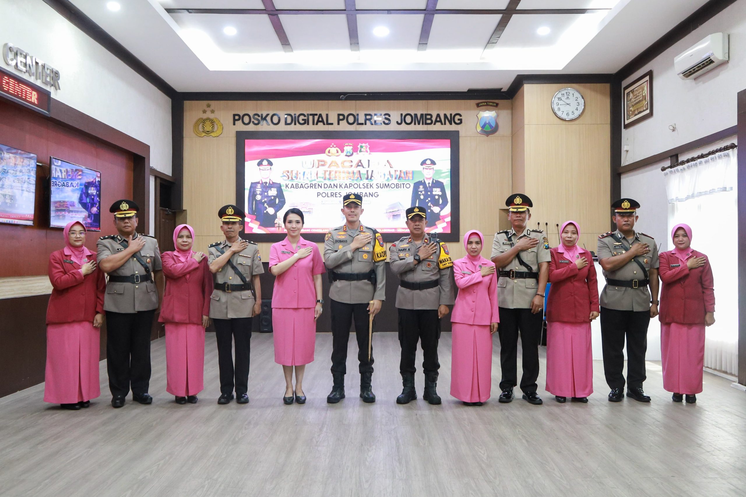 Upacara sertijab untuk Kabagren dan Kapolsek Sumobito Polres Jombang digelar di Ruang Jombang Comand Center (JCC) Mapolres Jombang, Rabu (23/10/2024) pagi.