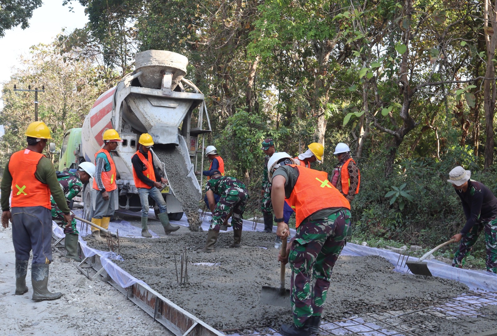 BOJONEGORO, – Pembangunan jalan cor beton sepanjang 1.372×3,5 meter yang menghubungkan Desa Soko Kecamatan Temayang dengan Desa Pajeng Kecamatan Gondang Kabupaten Bojonegoro sedang dikebut oleh personel Satuan Tugas (Satgas) TNI Manunggal Membangun Desa atau TMMD bersama masyarakat setempat untuk memenuhi tenggat waktu yang telah ditetapkan.