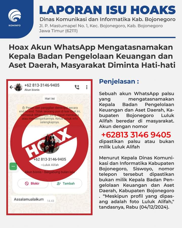 Kepala Dinas Komunikasi dan Informatika Kabupaten Bojonegoro Siswoyo memastikan nomor WhatsApp tersebut bukanlah milik Kepala BPKAD Kabupaten Bojonegoro Luluk Alifah. Terlebih akun WhatsApp tersebut terdaftar sebagai akun bisnis yang bergabung pada bulan lalu.