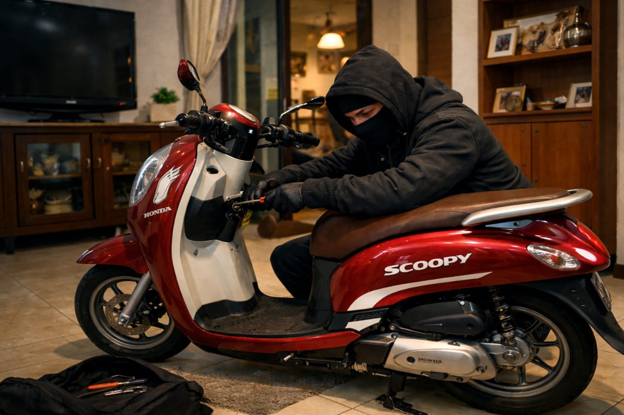 Sementara Sejak sore hari, motor Scoopy miliknya tanpa kunci kontak menancap telah diparkir di dalam rumah berdampingan dengan motor Honda Revo yang kuncinya masih menempel.