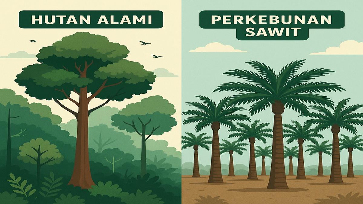 Hutan berperan dalam menyerap karbon, mengatur siklus air, dan menjaga suhu lokal. Sementara itu, perkebunan sawit hanya menjalankan fungsi produksi minyak, tanpa peran ekologis yang signifikan.