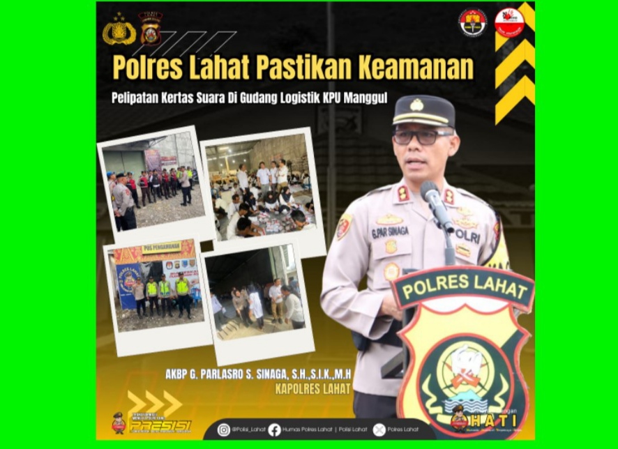 Mendekati Pemilukada di kabupaten lahat tepat nya pada tanggal 27 November 2024 saat ini telah memasuki tahapan pelipatan kertas suara untuk Pilkada tahun 2024 sedang berlangsung di Gudang Logistik Komisi Pemilihan Umum (KPU) Kabupaten Lahat, yang berlokasi di daerah Manggul. Kapolres Lahat, AKBP God Parlarso Sintor Sinaga SH, SIK, MH, memastikan bahwa proses ini berjalan lancar dan aman dengan pengamanan ketat dari personel Polres Lahat, dengan menerjunkan sebanyak 50 personel untuk menjaga keamanan dan ketertiban selama proses pelipatan. Pengamanan dilakukan di berbagai lokasi, termasuk halaman, area depan, dan didalam gudang logistik.