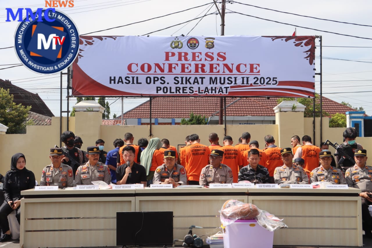 Kapolres Lahat AKBP Novi Edyanto SIK.MIK, yang di dampingi, Kabag Ops Kompol Toni Arman SH.MSi, Kasat Reskrim AKP Redho Riski Pratama STrk.SIK.MSi, Kasat Narkoba Iptu LAE Tambunan SH.MH, kasi Humas AKP Mastoni SE, Kasi Was AKP Candra Gunawan SH,Propam AKP Edwar Gultom, Kapolsek Kota AKP Edy Surisno SH, Kapolsek Merapi Iptu Candra Kirana SH.MH, Kapolsek Kikim Barat Iptu Jepri SH sekira pukul 0.00.Wib memimpin Press Conference hasil Operasi Sikat Musi II 2025 kegiatan ini di gelar di halaman Mapolres Lahat