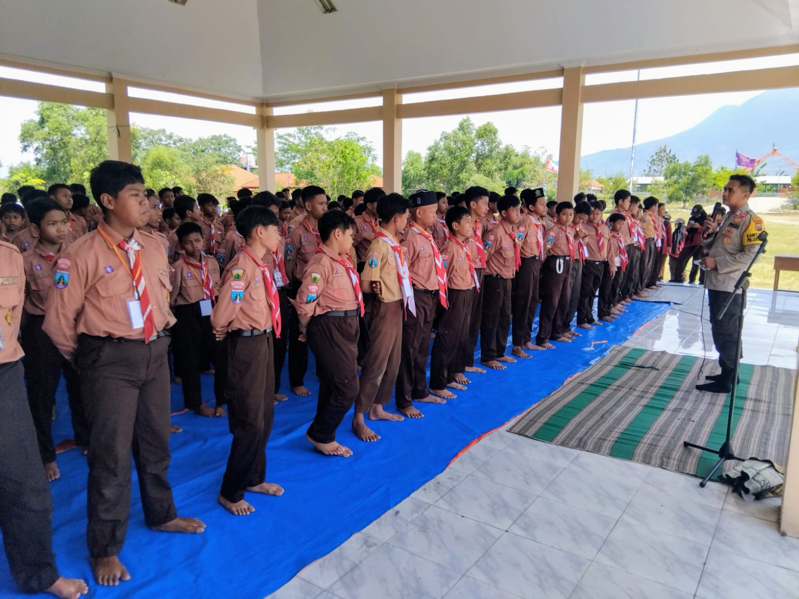 Kanit Binmas Polsek Krembung, Aiptu Adin Purwanto bersama Aipda Syamsu, hadir langsung memberikan arahan kepada peserta, panitia, serta pendamping perkemahan Pramuka SMPN 1 Tulangan. Kegiatan ini diikuti sebanyak 390 siswa dengan 30 pembina di bawah tanggung jawab dari pihak sekolah Agus Pujiono.