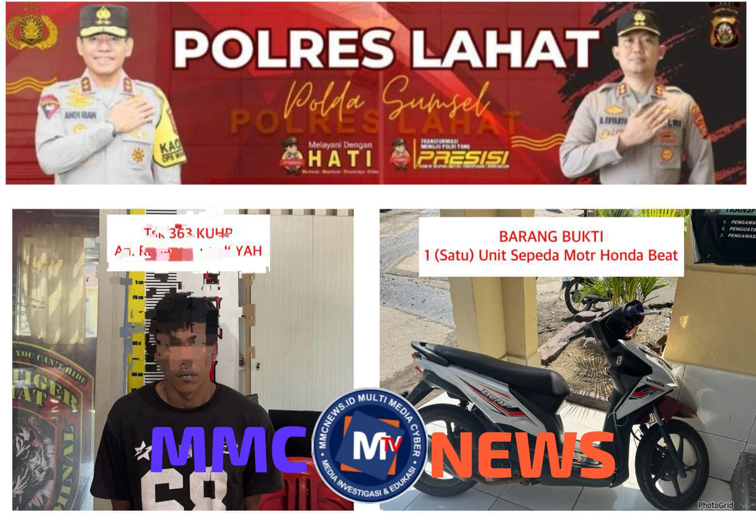 Kapolres Lahat AKBP Novi Edyanto. SIK. MIK melalui Kasunsi Penmas Humas Polres Lahat Aiptu Lispono. SH mengatakan Kejadian bermula Pada Hari Jumat Tanggal 26 September 2025 sekira jam 02.30 Wib bertempat di Desa Tanjung Payang Kecamatan Lahat Selatan Kabupaten Lahat tepatnya dil Kafe Rahmatenurut pengakuan Tersangka Pelaku inisial RES di jadapan penyidik mengukapkan Pencurian yang dilakukan dmengambil 1 (satu) unit sepeda motor merk Monda Beat warna putih merah Nopol: BG 6454 EAF Noka :MH1JFP114K657068 Nosin: 2365544444444 milik korban yang terparkir dihalaman Kafe Rahmat tersebut