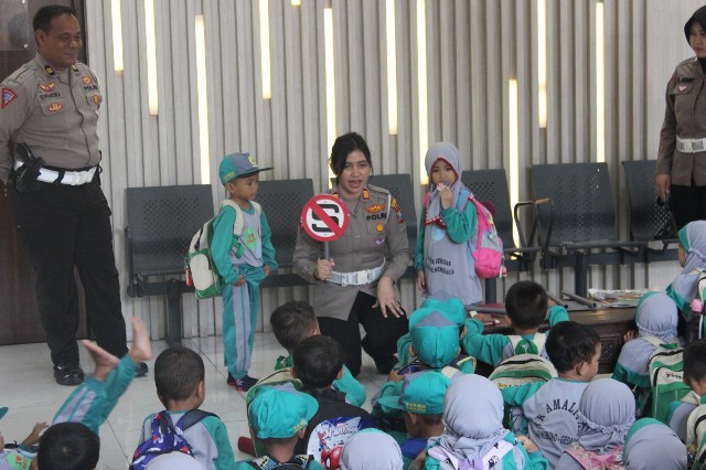 Seperti ditunjukan Ipda Liana tentang rambu-rambu lalu lintas kepada siswa-siswi PG dan TK Amaliyah. “Lampu merah ini pengendara harus berhenti ya adik-adik, dengan mengerti dan mematuhi peraturan tertib berlalu lintas maka dapat mencegah terjadinya kecelakaan lalu lintas. Mari bersama jadi pelopor keselamatan berkendara di jalan raya,” jelasnya.