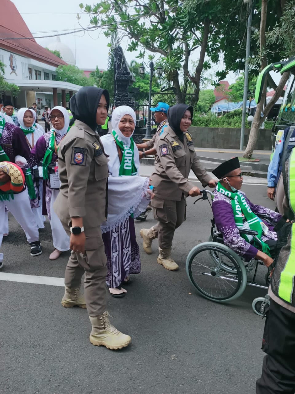 Dengan ramah dan penuh perhatian, para Satpol PP wanita tersebut membantu para lansia menaiki bus, mendorong kursi roda, bahkan membawakan koper para calon jamaah haji