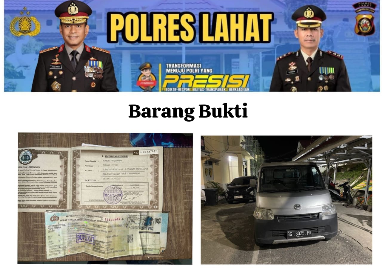 Dua Orang Laki _Laki Tersangka Inisial BE (32 tahun) warga asal Desa Ulak Lebar Dusun II Kecamatan Lahat dan rekan nya AM (41 tahun) yang berdomisili dari Desa Purwosari Kecamatan Merapi Barat Kabupaten Lahat Propinsi Sumsel diduga telah melakukan Penggelapan Satu unit kendaraan Bermotor /R4 dengan No.Pol : BG 9561 NS, Jenis Merk Daihatsu Tahun 2015, dengan NOKA : MHKP3CA1JFK106200, NOSIN : 3SZDFT2375 atas nama Milik korban/ Pelapor an.WI (30 Tahun) warga yang beralamat Desa Pagar Sari Kecamatan Lahat Kabupaten Lahat saat ini kedua tersangka terpaksa mendekam dalam terali besi Polres Lahat Polda Sumsel