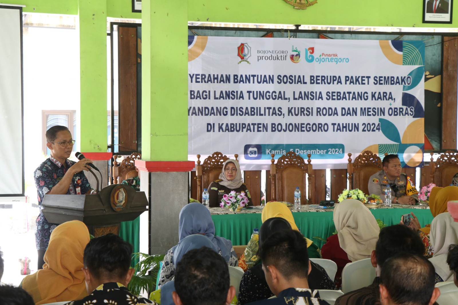 Pemerintah Kabupaten Bojonegoro melalui Dinas Sosial menyalurkan sejumlah bantuan sosial (bansos) bagi kelompok rentan lansia tunggal, lansia sebatang kara, dan penyandang disabilitas. Adapun penyerahan bansos dilaksanakan secara simbolis bertempat di Desa Pungpungan Kecamatan Kalitidu, Bojonegoro, Jawa Timur. Kamis, (05/12/2024).