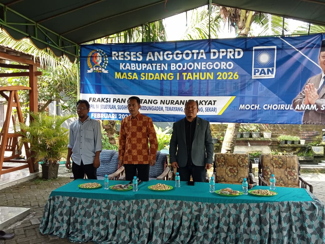 BOJONEGORO – Masa sidang 1 tahun anggaran 2026 Fraksi PAN DPRD Kabupaten Bojonegoro, melalui Moch. Choirul Anam, S.Pd., M.AP., menggelar kegiatan reses uapaya untuk menyerap aspirasi masyarakat secara langsung sekaligus memperkuat komitmen pemerataan pembangunan di wilayah Daerah Pemilihan (Dapil) IV di antaranya Kecamatan Bubulan, Sugihwaras, Kedungadem, Temayang, Gondang, dan Sekar, bertempat di Dusun Slinggang, Desa Sidomulyo, Kecamatan Kedungadem, Bojonegoro, Jawa Timur. Pada Jumat (06/02/2026). siang.