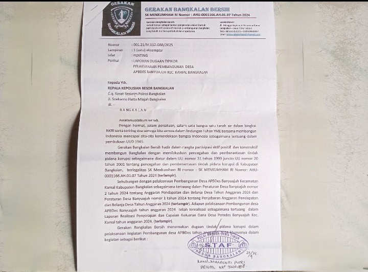 Rabu (23/04/25), LSM GBB mengajukan surat laporan ke Polres Bangkalan (Kasatreskrim) terkait dugaan tindak pidana korupsi dalam penyelewengan dan penyalahgunaan Anggaran Pendapatan Belanja Desa (APBDes) di Desa Banyuajuh Kecamatan Kamal, Kabupaten Bangkalan.