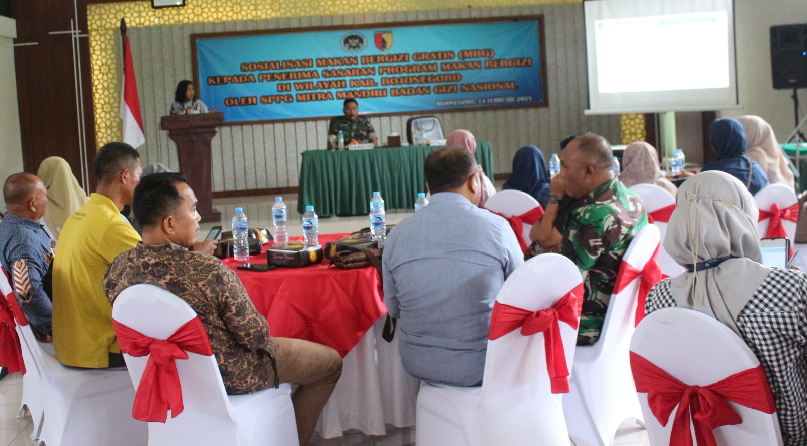 Bojonegoro – Dalam rangka mendukung program unggulan Presiden Prabowo Subianto dan Wakil Presiden Gibran Rakabuming Raka yakni Makan Bergizi Gratis (MBG), Satuan Pelayanan Pemenuhan Gizi (SPPG) Mitra Mandiri Badan Gizi Nasional (BGN) menggelar kegiatan Sosialisasi program MBG di Gedung Ahmad Yani Markas Kodim 0813 Bojonegoro, Jum’at (14/2/2025).