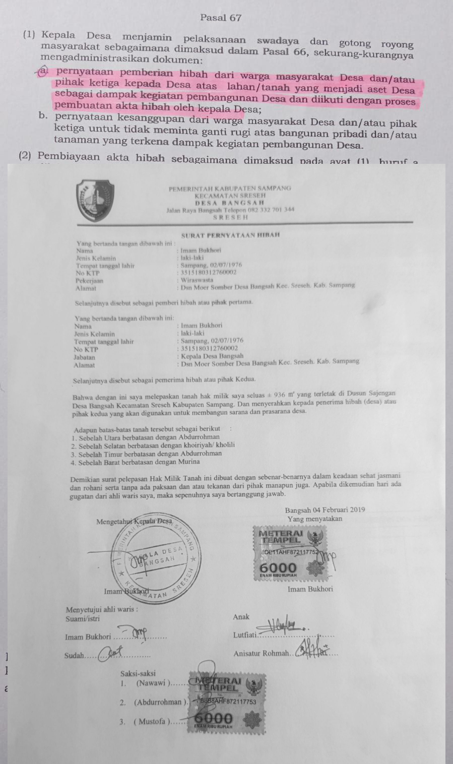 Ket Foto; Surat pernyataan hibah imam Bukhori mantan kades kepada pemerintah desa Bangsah.