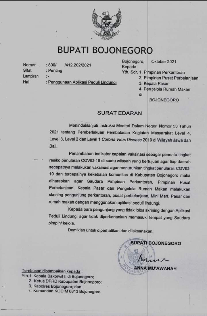 Pada instruksi Mendagri, penambahan indikator capaian vaksinasi sebagai penentu tingkat risiko penularan covid-19 serta mewujudkan tercapainya kekebalan komunitas di Bojonegoro. Oleh karena itu, Pemerintah mengimbau kepada pimpinan perkantoran, tempat perbelanjaan, mini market, pasar dan rumah makan untuk melakukan skrining kepada pengunjung menggunakan aplikasi peduli lindungi.